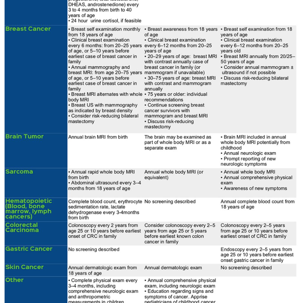 Consider taking the following screening guidelines comparison to your local doctor or to submit in an appeal to your insurance company if you find that screening is not covered. Your genetic counselor might want to customize the screening recommendations, taking into account your family cancer history.